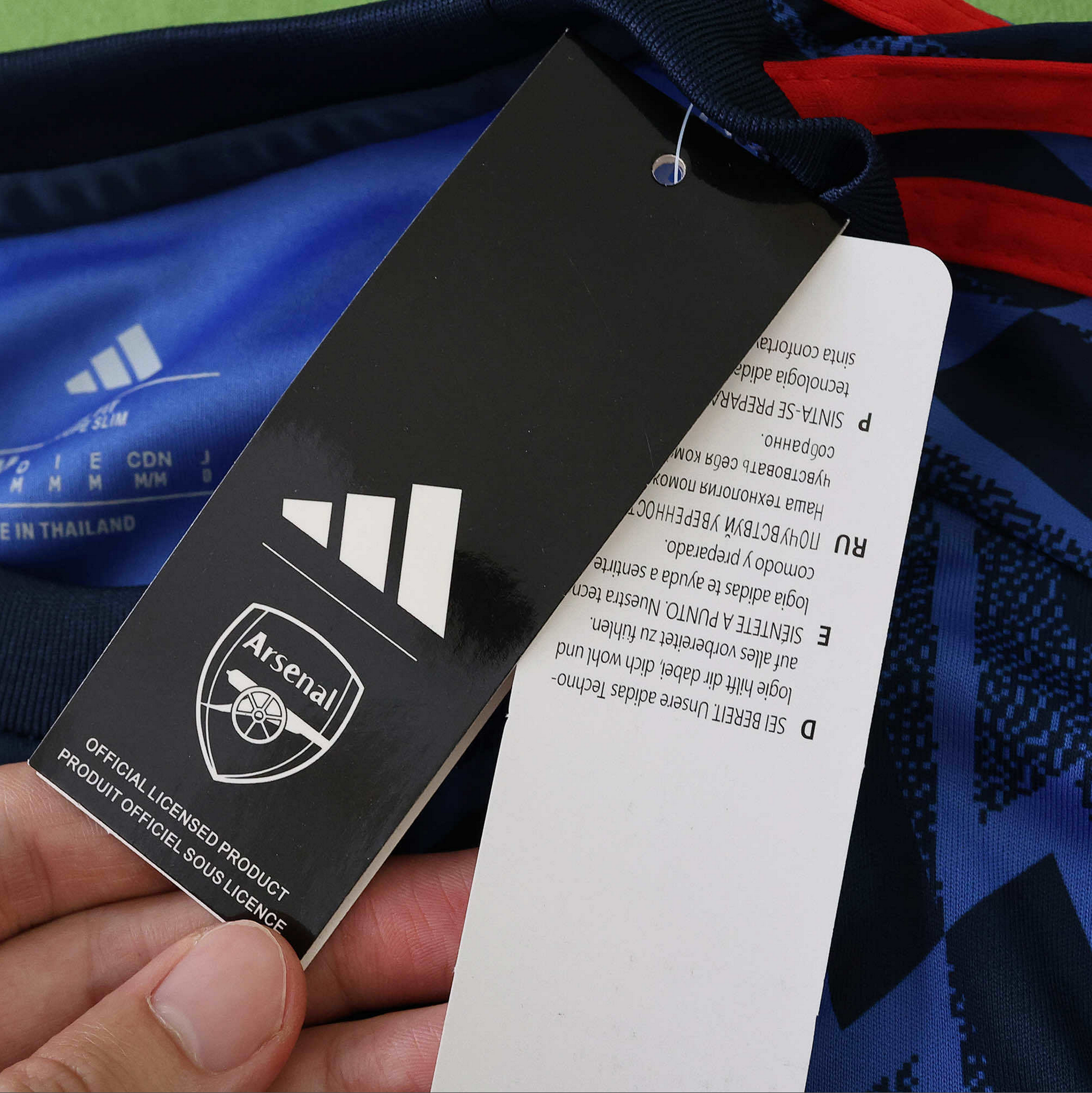 Arsenal 25/26 bortedrakt kommer i marineblått med et tydelig lyn-inspirert mønster og røde adidas-detaljer. Sølvfargede logoer gir en skarp kontrast, og det lette, pustende materialet sørger for høy komfort både på kampdag og til hverdags.